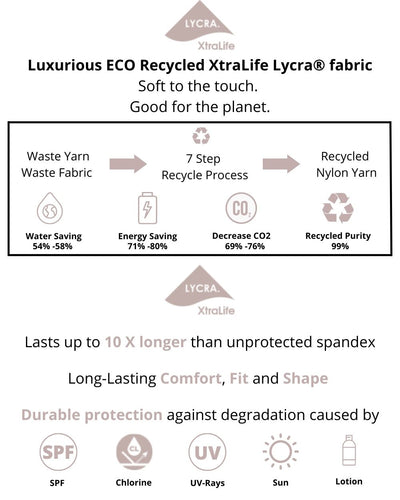 All of our products are made from XtraLife Lycra fabric and 14 karat gold plated hardware, for chlorine and salt water resistance.