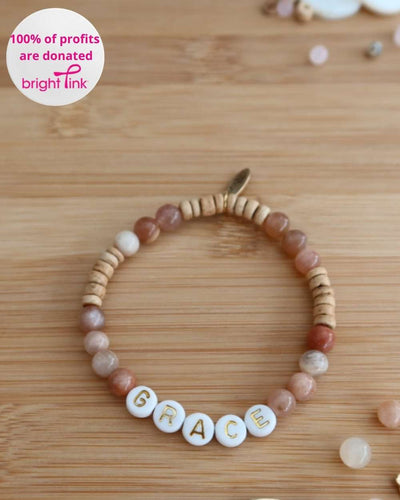The GRACE Bracelet is designed with a blend of warm earthy tones from Round Sunstone beads and Coconut Rondelle Disk beads. Painted gold lettering completes the piece, providing a gentle reminder to extend grace to others—and just as importantly, to yourself! Slip on this sunstone bracelet for an elegant finishing touch to your look, and an instant infusion of kindness and gratitude.